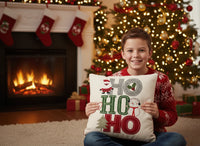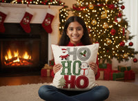 A cheerful and graphic statement piece, this cushion cover features the iconic "HO HO HO" slogan creatively decorated with Santa, a snowman, and a Christmas tree.